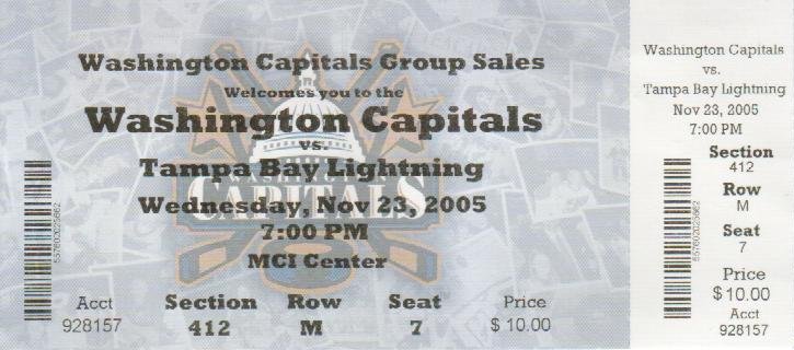 We located a nearby mall to grab some lunch and there were some tense (for us) moments as it became apparent we were the only white people in the building, as we started ordering our food we were quickly categorized into the 'damn tourists' category and people stopped giving us funny looks. The food was once again both cheap and plentiful, a very satisfying feature of american eateries. In the evening we went to an ice hockey game, the Tampa Bay Lightning visiting the Washington Capitals, tickets being a bargain $5 each. Our seats were very high up but the whole upper deck was canted at a vertigo inducing angle which made you feel like you were almost directly above the rink. Tuesday, November 22. 2005